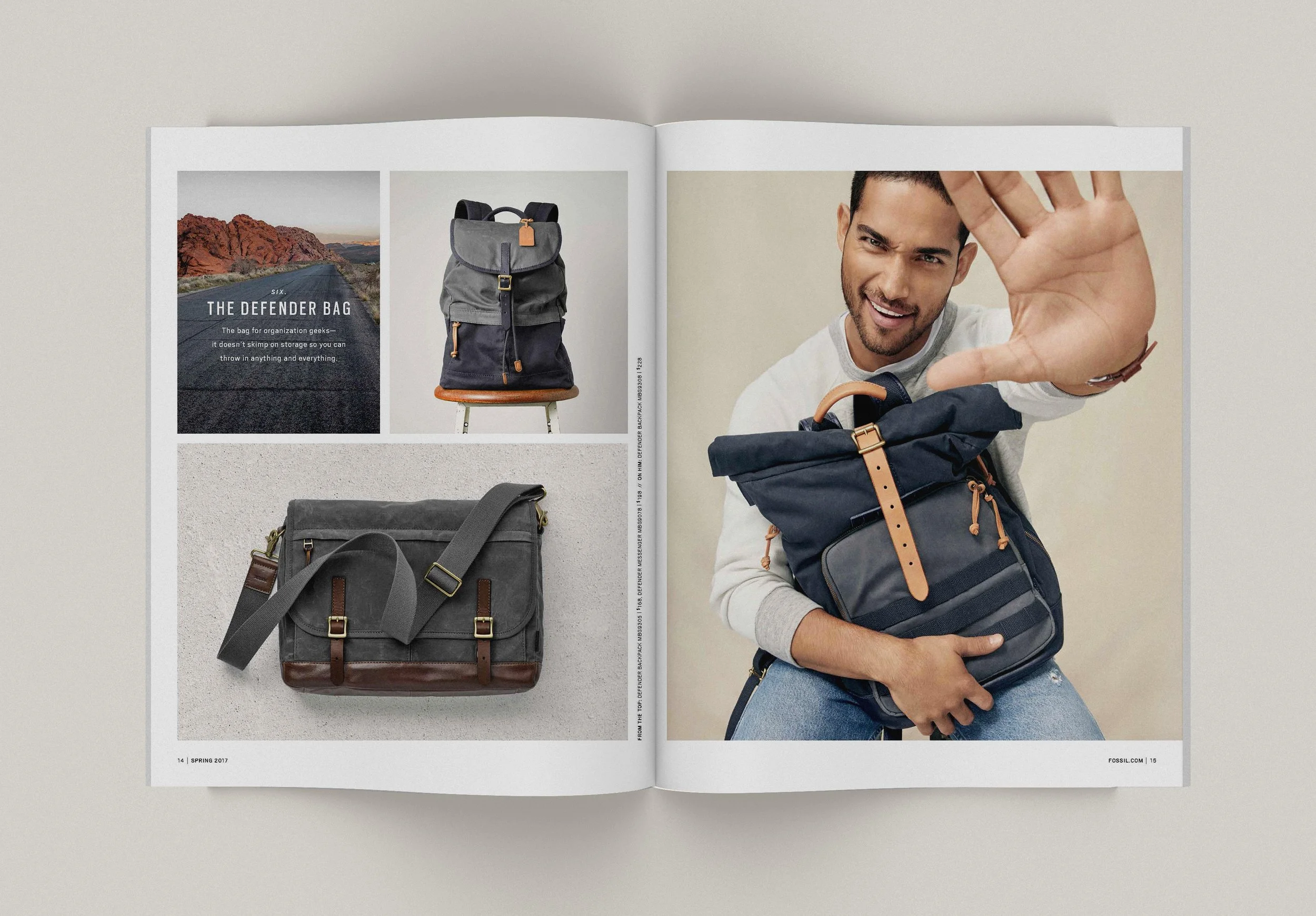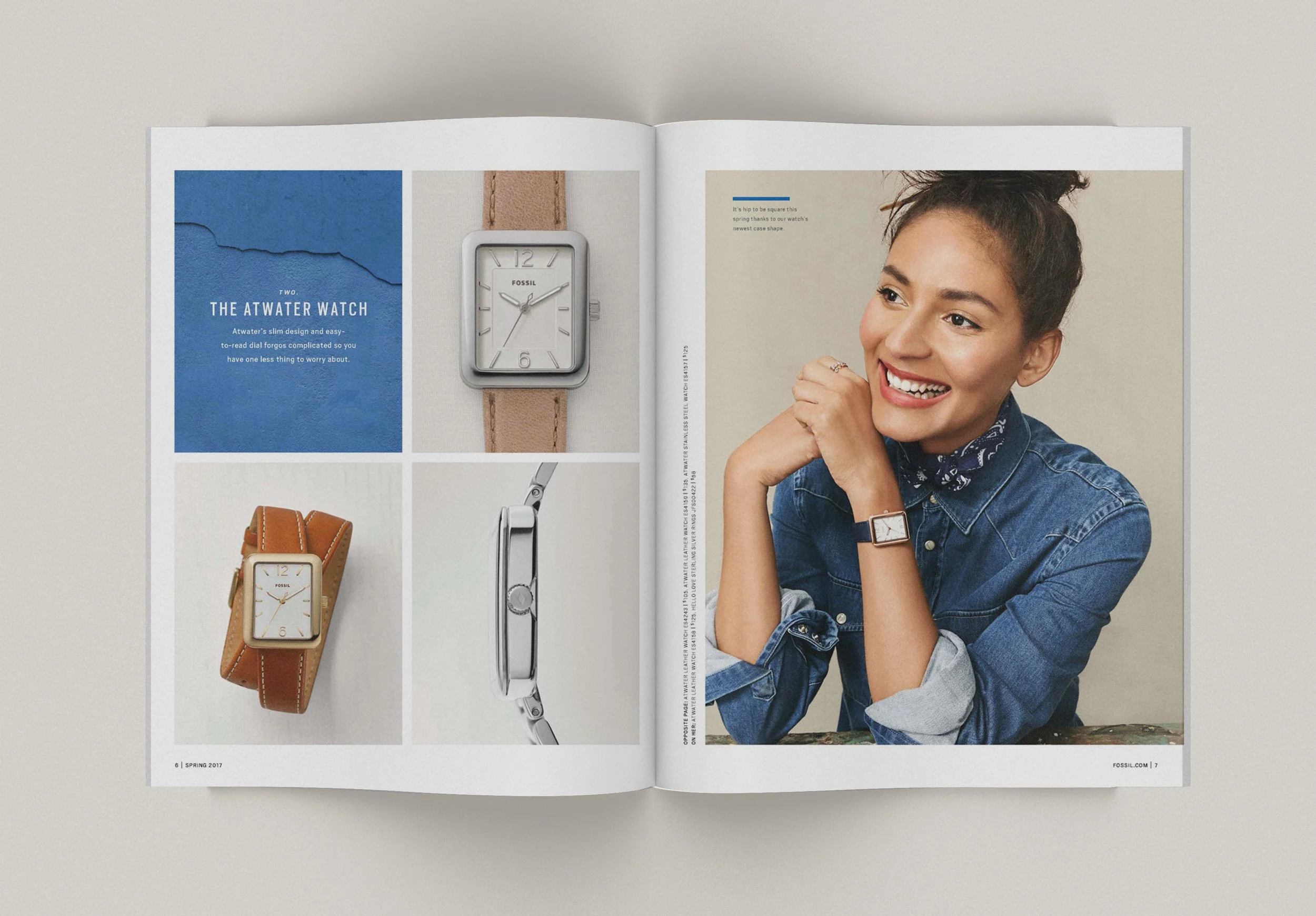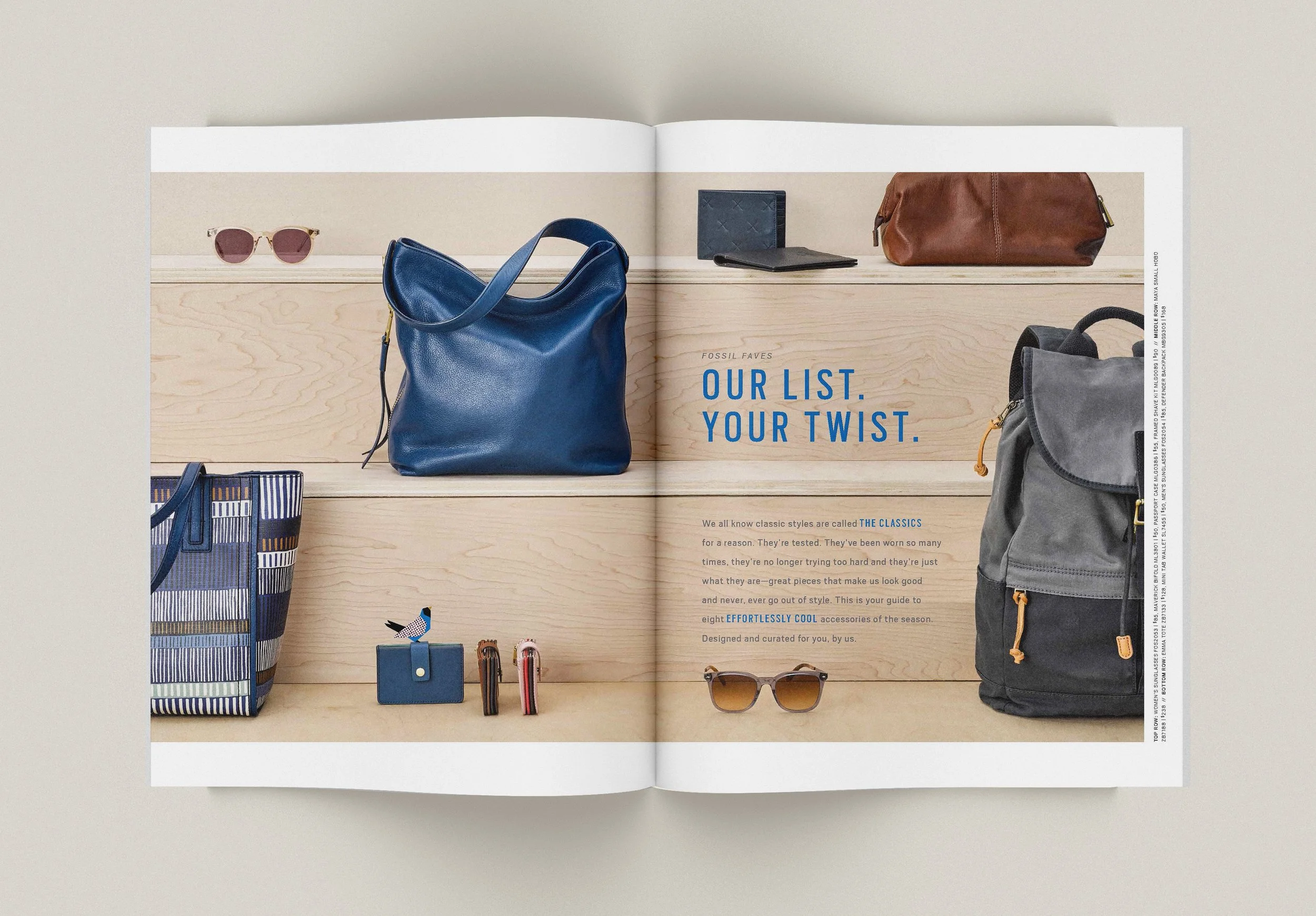 Art directed product photography (concept, on-set direction, and retouching notes) and designed catalog layouts for Fossil.